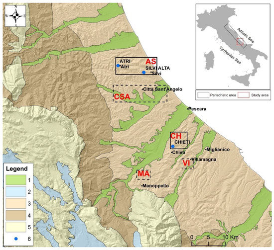 The five study areas are in the hilly Periadriatic region in Central Italy at elevations up to 300 m above sea level (a.s.l.); they are, from north to south, Atri and Silvi (AS), Città Sant’Angelo (CSA), Chieti (CH), Villamagna (VI), and Manoppello (MA) (Figure 1).