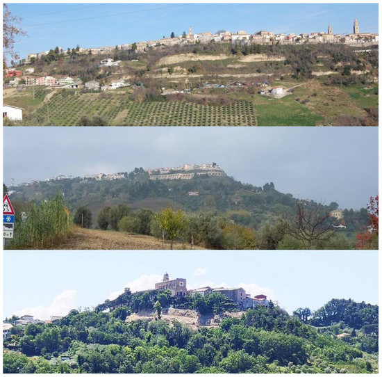 The abovementioned economic transition caused a progressive abandonment of local aquifers located in the terrigenous sandy and gravelly stratigraphic sequence that constitutes the top of important hills in the Periadriatic area. Here, springs and elevated flat plains bounded by steep slopes provided optimal topographical and morphological conditions for the development of towns (Figure 2) that played an important political and commercial role a few centuries ago [22].