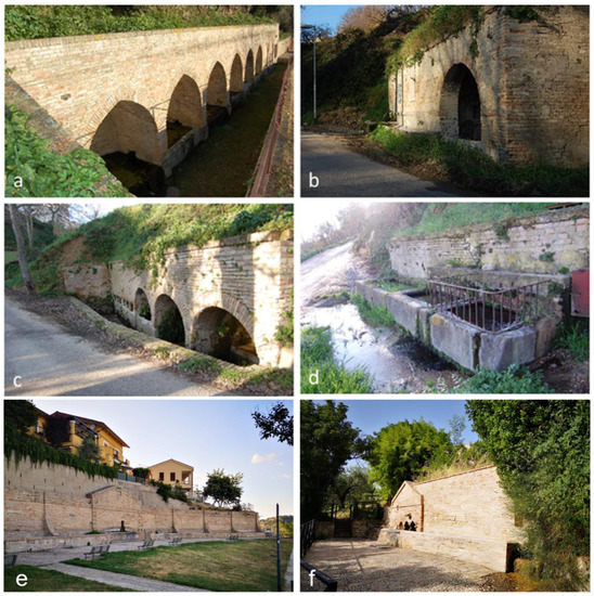 Some examples of tapped springs of the study area discharging at the interface between permeable and non-permeable lithotypes located at the border of the historical town of Atri (a–d), Chieti (e), and Pescara (f); (a,e,f) are examples of architectural restoration.