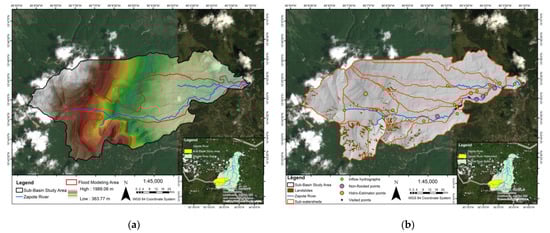 (a) Sub-basin study (black polygon) and flood modeling (red polygon) areas, topography, and river location; (b) sub-watersheds, landslides detected by satellite image, inflow hydrograph, and measurement points.