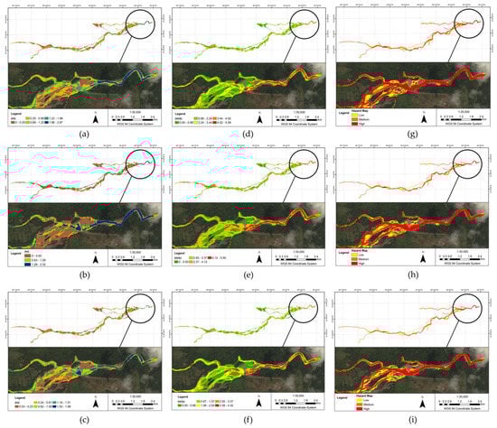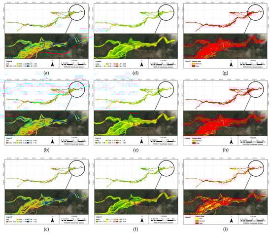 Regarding hazard maps, three flood intensity categories were determined depending on velocities and depth flow product, according to the methodology developed in [], which is included in FLO-2D []. Each clean-water or debris flow hazard intensity was assigned a representative color in the risk map. Red represents a severe danger to people and the destruction of physical structures. Orange represents medium danger; people are in danger outside their homes, and structures can be damaged and destroyed depending on the construction characteristics. Yellow is a low hazard; people are in very low or almost nonexistent danger, and structures may suffer minor damage, but flooding and sediment could affect the interior of homes [].
