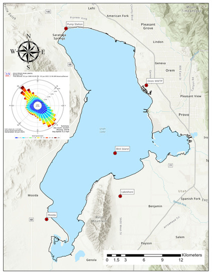 AD sampling sites around and in Utah Lake and a wind rose showing the wind direction at the Provo Municipal Airport based on data from June 1990 to June 2021, generated by Iowa Environmental Mesonet (IEM), Iowa State University generated 2 June 2021 (https://mesonet.agron.iastate.edu, accessed 2 June 2021).