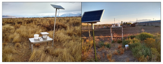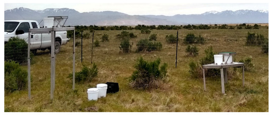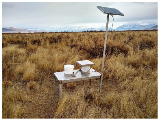 Figure 2 shows the sampling site at Mosida with both dry and wet deposition buckets. We collected samples from all five sites (Figure 1) using 500 mL clean Nalgene© wide-mouth amber HDPE bottles. Samples were analyzed by the Environmental Analytical Laboratory on the campus of Brigham Young University (https://pws.byu.edu/eal, accessed on 2 June 2021). We computed deposition rates as follows: we multiplied the nutrient concentration of each sample (mg/L) by the volume of the sample (L), which resulted in mg of nutrients deposited in the sample bucket. We used deionized water to bring samples up to analytical volume. We calculated unit area deposition rates by dividing the total deposition mass in milligrams for each sample by the surface area of the sample bucket (0.0615 m2) and the time represented by the sample (usually 1 week) following previous studies [9,36].