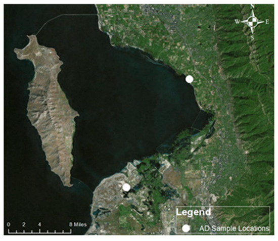 Utah Lake is a eutrophic freshwater basin-bottom lake that sustains a diverse ecosystem, which often leads to algal blooms that include cyanobacteria. Recent studies have shown that AD provides significant nutrient loads to the lake [9]. It is a popular recreation area and supplies water to many irrigation companies. Utah Lake experiences high P, and N loadings from multiple sources. Total phosphorus (TP) and chlorophyll-a values [20] indicate that the lake is moderately eutrophic based on the Carlson Index [21]. However, the lake experiences significant algae blooms more typical of a eutrophic lake.