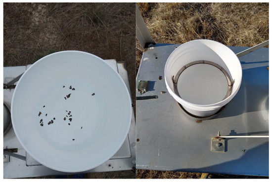 Our earlier work included insects and other materials that were collected in the sample buckets as we reasoned these samples, including insects, represented contributions to the nutrient load on the lake [9,36]. However, including these contaminants—mostly insects—often resulted in large AD rates and was subject to criticism. Previously, we identified large amounts of insects, with the great majority being a terrestrial bee species Halictidae Lasioglossum, mostly at the Mosida location (Figure 5). For example, during the 2019 sampling year, from July to August, we counted approximately 100+ bugs per sample at the Mosida location in samples taken over a 4 week period.