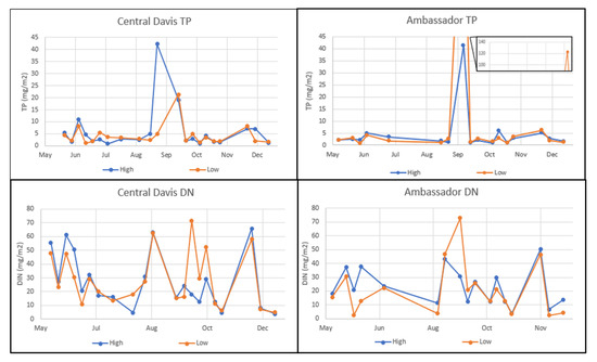 A graphical comparison of TP data (top panel) and DIN data (bottom panel) collected over 8 months from paired high and low tables at two different sites, Central Davis and Ambassador, in the left and right panels, respectively. We did not remove any outliers from these data.