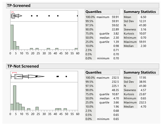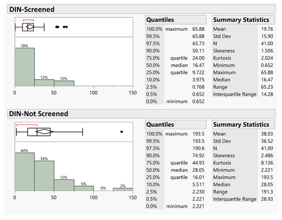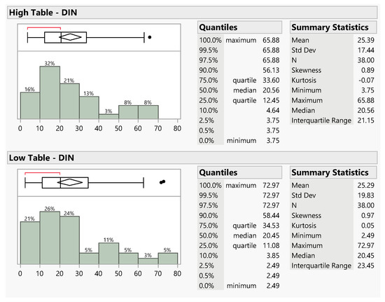 Figure 9 and Figure 10 show that both the TP and DIN data are skewed by both the shape of the histogram and by the fact that the mean (center of the diamond) and the median (center of the box) are not aligned. The whisker plot is also asymmetric, another indication of a skewed distribution. The red brackets show that the densest region that contains 50% of the data is below the median value, but above the 25th quartile, indicating a data cluster.