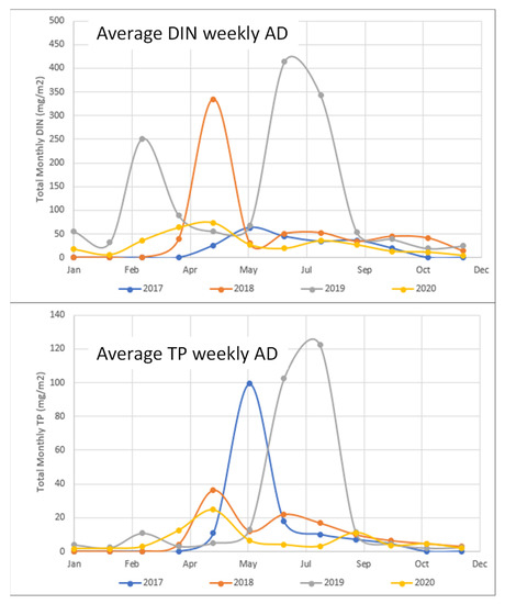 Figure 15 shows the weekly loads of TP and DIN for 2020 and 2019 in the top and bottom panels, respectively. The figure shows that there is significant seasonal variation in both years. In general, the winter months had minimal AD loads with maximum AD occurring during the summer. The 2019 data are higher than the 2020 data, but as noted, the 2019 data were from unscreened sample buckets. In addition, the large spike in the 2020 data occurred in May prior to screen installation. As we discussed, these large peaks are most likely the result of contributions from large numbers of insects in the samples. With screened sample buckets, the 2019 data would probably be similar to the 2020 data collected after June, with peaks significantly lower.