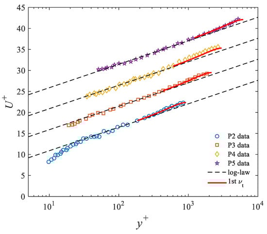 Computed mean streamwise velocity profiles are obtained from (16), and the second eddy viscosity given by (14) and are validated by experimental data [] (Table 1). The same boundary condition is applied (velocity equal to the log-law value at ). Figure 3 shows comparisons between computed velocity profiles (red solid lines) and experimental data (symbols). The model allows log-law profiles (black thin dashed lines) to be improved in the outer region. Figure 3 shows that computed velocity profiles (red solid lines) show good agreement and improve the prediction of log law (black dashed thin lines). In order to improve the results, the momentum equation is resolved with a second boundary condition at the lower limit of the logarithmic layer, i.e., , where the velocity is given by the log law as . Results (magenta thick dashed curves) allow the prediction to be improved, particularly for high Reynolds numbers.