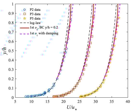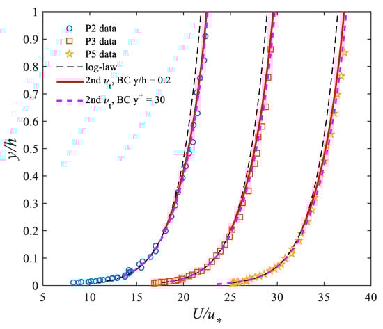 Computed mean streamwise velocity profiles are obtained from (16) with the first eddy viscosity given by Equation (12) and are validated by experimental data []. The following boundary condition for the velocity is applied at (or ): ; where and [].