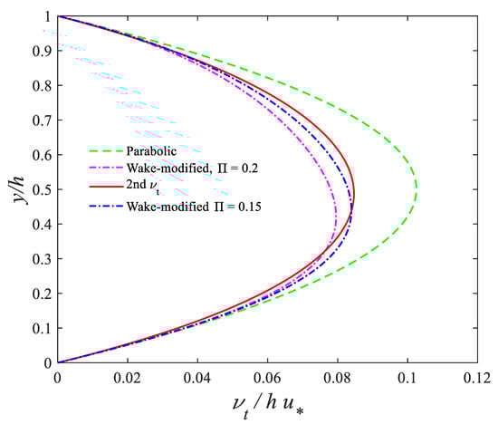 where Π is the Coles’ parameter. In Equation (2), the eddy viscosity (1) is corrected by dividing the parabolic eddy viscosity profile by the term of the log-wake velocity profile.