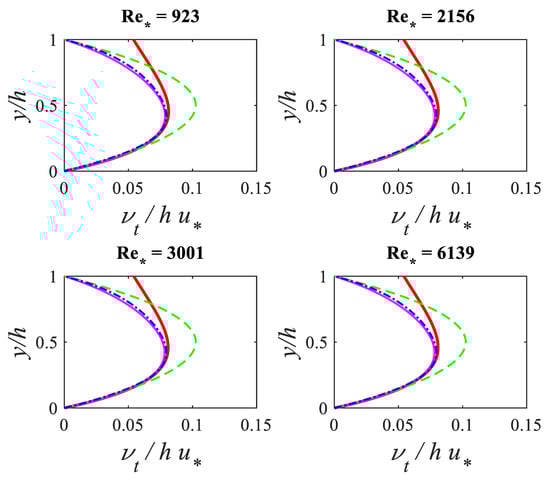 For the -dependent eddy viscosity given by the first model (Equations (20) and (21)), Figure 5 shows comparisons for the vertical distribution of the eddy viscosity for the four friction Reynolds number. The eddy viscosity curves (thick red solid lines) obtained from the first model (Equation (20)) show that the eddy viscosity increases from the bed—the maximum value is located at around the half water depth and then decreases until the free surface. However, the eddy viscosity does not vanish at the free surface. With the condition of an eddy viscosity equal to zero at the free surface, the profiles with the damping function (Equation (21)) predict everywhere smaller values than the parabolic eddy viscosity (thin magenta solid lines) and have a shape similar to the log-wake-modified eddy viscosity profile (blue dash-dotted lines). Interestingly, with a value of Coles’ parameter , eddy viscosities from both the first model (Equation (21)) and log-wake-modified profile (Equation (19)) are almost superimposed. The value of Coles’ parameter is the same as that proposed from open-channel flow experiments []. This provides an explanation about the accuracy of the computed velocity profiles obtained by the first model (Equation (21)) in the outer part of free surface flows.