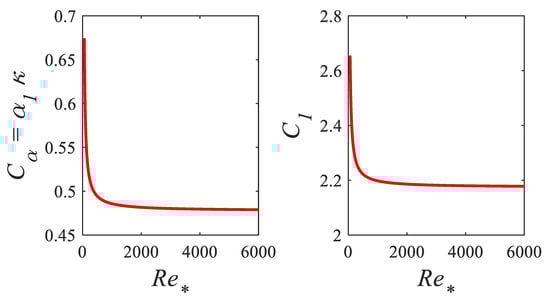 When used for the resolution of the momentum equation, the parabolic eddy viscosity profile (1) is unable to predict accurately velocities outside the log layer []. In order to improve the parabolic eddy viscosity (Equation (1)), it is corrected in accordance with Coles’ log-wake law for velocities as []