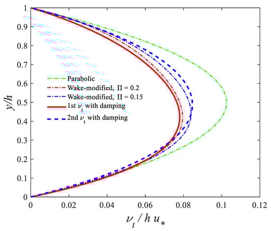 Figure 4 and Figure 5 show comparisons of the vertical distribution of the different eddy viscosity models. The three -independent Equations (18), (19), and (22) are first compared. Figure 4 shows that the shape of the eddy viscosity given by the second model (Equation (22)) (red solid line) is similar to the parabolic profile (green dashed line), where the maximum value is located at the same position, i.e., half water depth (. Even though the second model exhibits a similar shape, it predicts smaller values than the parabolic profile. The profile obtained from the second model is compared to log-wake-modified (dash-dotted lines) profiles. The magenta dash-dotted curve is from the log-wake-modified eddy viscosity given by Equation (19) with a Coles’ parameter . With a smaller value of , the blue dash-dotted curve (for is closer to the eddy viscosity given by the second model. This value ( is close to values found for open-channel flow experiments [,]. This provides an explanation about the accuracy of the computed velocity profiles obtained by the second model in the outer part of free surface flows.