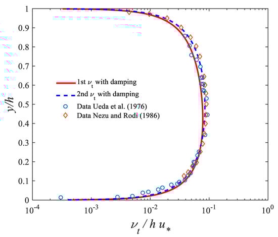 Figure 8 shows a comparison between the two proposed eddy viscosity models (24, 22) and experimental data of eddy viscosity [,]. In addition to the experimental data of Nezu and Rodi [], data from experiments of Ueda et al. [] are used, which seem to confirm the same behavior. Figure 8 shows that profiles obtained from both models show good agreement with experimental data of eddy viscosity.