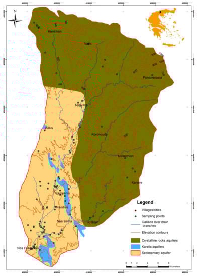 Map showing sampling points in relation to hydrolithologic categories of aquifers within the boundaries of the GallikosRiver basin [].