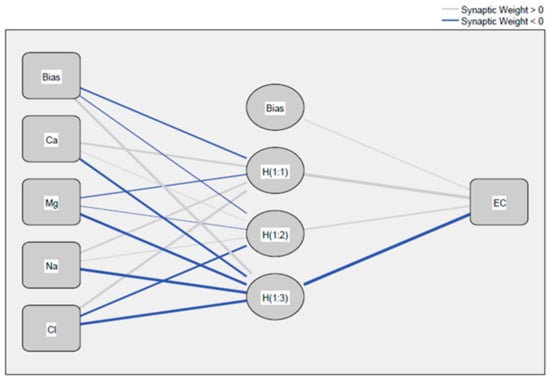 In the last few decades, artificial neural networks (ANNs) have been widely applied in the area of water quality modeling. They are considered a prediction tool and have been widely used in various fields such as flood prediction [,], land use [], and water quality [], or to predict parameter values such as electrical conductivity and total dissolved solids based on other variables measurements [,,,,,]. They have also been used in hydrogeology to determine aquifer parameters [,,], evaluate the qualitative characteristics of groundwater [], and predict groundwater level [,,,]. ANNs are information processing systems consisting of nonlinear interconnected processing elements called neurons [].
