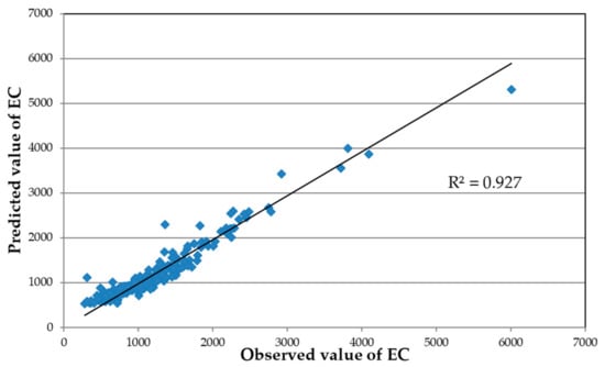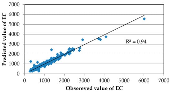 Coefficient of determination of observed versus predicted EC (μS/cm) values using the ANN model.
