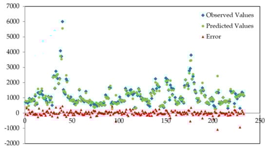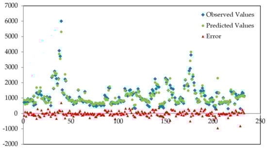 The structure of the ANN model is depicted in Figure 2. The results of the ANN are depicted in Figure 5 and Figure 6. According to these figures, the observed and predicted values for the majority of the samples were very close (R2 = 0.927), and the absolute error was around the horizontal axis.