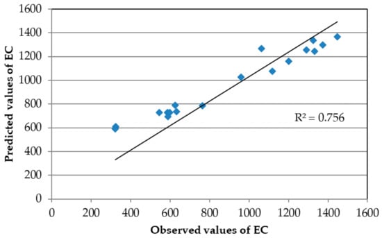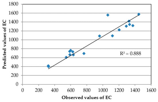 Coefficient of determination of observed versus predicted values of EC using the MLR model.