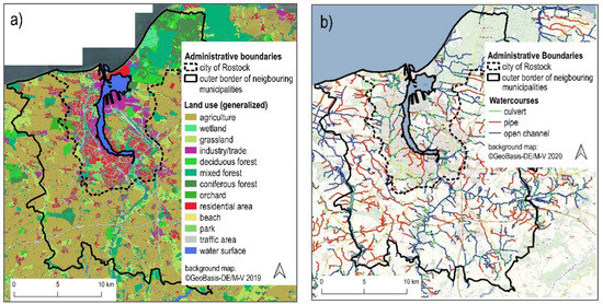 The study area, approximately 530 km2 in size, is located in the northeastern German lowlands and includes the Hanseatic City of Rostock and its 18 surrounding municipalities (Figure 1). The latter are part of the Rostock rural district. While the core of the city is dominated by uses such as housing, industry, and commerce as well as transport areas, the surrounding rural district is mainly characterised by arable land and grassland. The study area overlaps 19 largely independent surface catchments, with the headwaters of the streams mostly in the rural district and the mouths in the urban area of Rostock or the Baltic Sea.