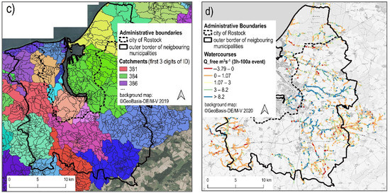 (a) Land use (generalized); (b) watercourses consisting of open channels, pipes and culverts; (c) catchments with first three digits of hierarchical ID (colors are chosen at random); and (d) free profile capacities (m3s−1) at the example of the rain event 3 h–100 a.