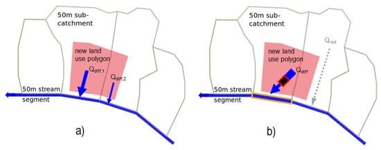 After intersecting the new polygon with the 50 m subcatchments, the change of peak runoff can finally be aggregated by segment ID and thus assigned to each receiving stream segment. There are two possibilities for the allocation of the runoff: (a) If no receiving segment is specified, the discharge is automatically distributed to the segments according to its area share in the subcatchment (Figure 4a,b) It is also possible to assign the discharge change to a defined segment and to throttle it via a maximum permissible discharge (Figure 4b). In the case of Figure 4b, the corresponding stream segment receives the peak runoff difference and the neighbouring upstream segment loses runoff compared to the actual state (Qred) due to the reduced drained area.