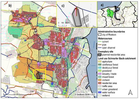 Schmarler Bach area with land use of the actual state. (a) Outline map, (b) complete Schmarler Bach catchment with the exemplary planned residential area in the central south (yellow box), (c) detail section of the planned residential area.