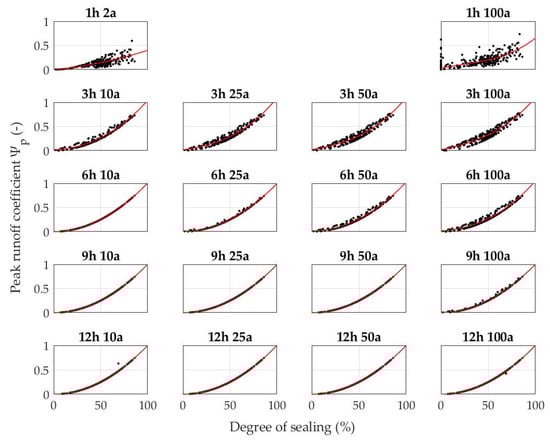 Basically, a clear polynomial dependence of the peak runoff coefficients on the degree of sealing is visible. This is also confirmed by the coefficients of determination in Table 4. In the case of block rainfall (3 h to 12 h), the strength of the dependency increases with duration, as conditions become more and more static. Within a duration category, the dependency tends to decrease from small to large return periods (respectively small to large rain intensities). For the duration 1 h with a clear intensity gradient, the scatter of the peak runoff coefficients around the function curve is significantly greater than for the block rainfall, which suggests that other factors, such as the area size or the flow length or the soil conductivity, superimpose the influence of the degree of sealing. In the case of the most severe event (1 h–100 a), it is noticeable that even the unsealed areas react as if they were sealed, since the conductivity of the soil is increasingly exceeded.