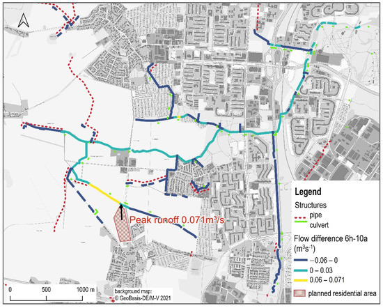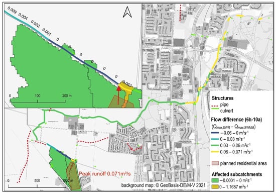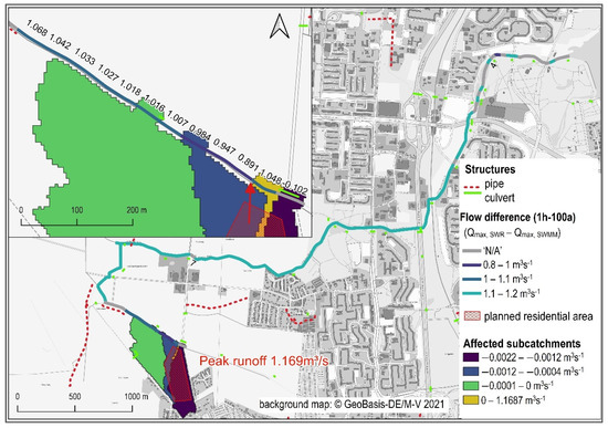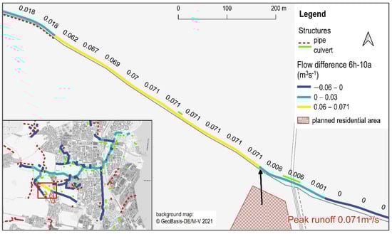 Figure 12 illustrates the effect of the user-defined discharge point. The sealed residential area overlaps four subcatchments where in this precipitation scenario (6 h–10 a) hardly any runoff was generated in the initial state. In the planning scenario, the surface runoff increases by 0.071 m3s−1 in the selected subcatchment (highlighted in yellow), while in the other three subcatchments the runoff slightly decreases or remains unchanged.