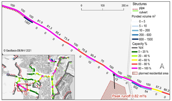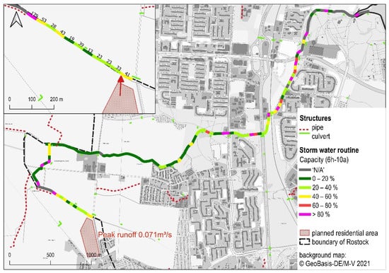 Despite the mentioned simplifying approaches, the SWR enables a rapid evaluation of the impact of land use change scenarios on flood risk. Figure 14 shows an exemplary result for flow capacities (Qmax, SWR/Qfull * 100 %) calculated by the SWR for the 6 h–10 a event. The colors of the stream segments indicate how critical its water level could rise in the planning scenario. Pink sections mark the areas that could potentially be affected by flooding, especially if the capacity is greater than 100%.