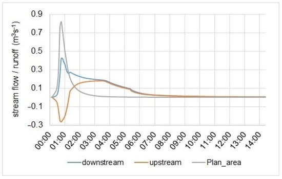 Runoff from plan area and simulated stream flow with rain event 1 h–100 a in the conduit directly downstream (max. flow = 0.42 m3s−1) and upstream (min. flow = −0.264 m3s−1) of the discharge point from the new residential site.