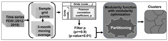 Recent developments in climate studies have included the permeation of network analysis for its analytical ability to uncover unique local to global properties of the climate []. The concept was first introduced in [] and is based on measured pairwise interactions between climates of different locations. Applications in drought studies have involved the identification of the drought tolerance and susceptibility of different cultivars, predictive modeling, comparing climate dynamics in different locations [,], and reducing the dimensionality of large climate data [], among other things. Network analysis has been used to expose both local and global variability in climate as measured by variables such as mean temperature and precipitation. Further, it allows for the division of large areas into clusters using community detection algorithms that evaluate similarity metrics between climate locations based on a characteristic climate variable, in this case, PDSI time series. Climate locations are grouped into clusters based on the calculated similarity measure. The division is such that, in each cluster, the fluctuations of a climate variable are in phase [] or have similar response to physical processes such as the El Niño–Southern Oscillation (ENSO) []. Limited studies have investigated the existence of community structure within local, state, or watershed levels. Many authors have studied the networks at national, regional [], and global [,] scales. Often, interesting patterns are uncovered that explain climate phenomenon that cannot be explained through conventional approaches.