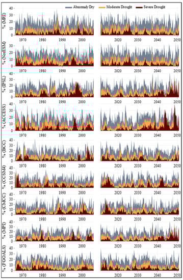 Temporal patterns were summarized by determining the percentage land area under abnormally dry (−1.0 to −1.9), moderate drought (−2.0 to −2.9) and severe drought (<−3.0) conditions. This provided an overview of the extent of drought conditions while comparing among the models. The desire was to capture and verify significant past droughts as well as identify potential future droughts.