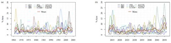 The historical period is characterized by cyclic patterns of moderate and severe drought with no clear uptrends or downtrends. In the near-term to projected period, some models (MRI, FGOALS) showed a downtrend and some (IPSL, ACCESS, MPI) showed uptrends in drought occurrences. These trends can generally be inferred from Figure 2, more clearly for moderate and severe drought categories. Figure 3a,b illustrates the trend of severe droughts only (PDSI < −2.9). There is a general agreement among most models of high proportions of USA land area being under severe drought between the periods 1966–1968, 1969–1972, 1995, 2012–2018, and 2048–2050. No definitive trend can be described comparatively for all the models.