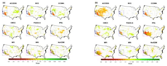 Considerable differences in the spatial–temporal occurrence of drought over the CONUS are observed among the nine models used in this study. However, over the historical period (Figure 4a), the models indicate a similar drying trend for parts of southwestern CONUS extending southern California, southern Nevada, and western Arizona. The region exhibits most rapid drying in the CONUS for the studied period. In other parts of the country, slow drying or wetting was observed, with minimal spatial similarity among the models. At least two to three models indicate a corresponding trend for specific regions. Relative to the historical period, the projected spatial–temporal trends (Figure 4b) show elevated gradients of drying for southwestern CONUS from ACCESS, CCSM4, CMCC, FGOALS, IPSL, MPI, and NorESM models. BCC and MRI models show slow drying and wetting for most parts of CONUS. Again, the projected spatial–temporal patterns are unmatched among most models for most parts of the country. Even so, a subset of the models show similar trends for specific areas. For example, CCSM4, CMCC, IPSL, MPI, and NorESM show drying in south Florida.