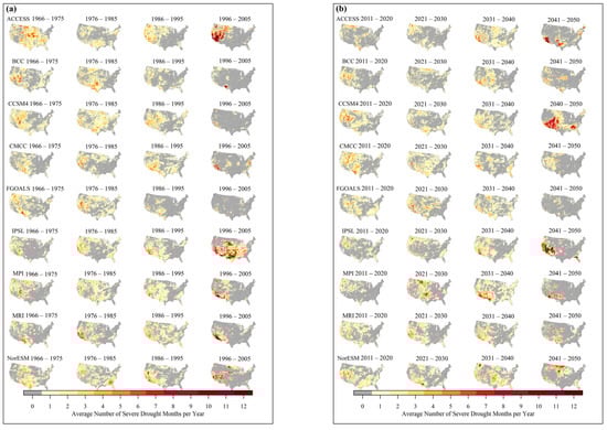 The spatial occurrence of severe droughts in decadal time periods for the historical (a) and projected (b) periods. Each map in the figure shows the average number of severe drought months per year for the indicated decade.