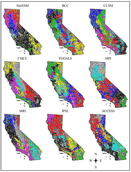 Climate networks constructed for California revealed the clusters in Figure 6. These clusters delineate regions that are similar in terms of temporal occurrence of drought between 2012 and 2018 as measured by PDSI. At least seven clusters can clearly be identified in all the models. These do not all spatially match among the models. However, there are specific clusters (labeled with similar numbers in Figure 5) that are identical among several models. The spatial extent of cluster 1 in Figure 6 seems nearly identical for NorESM, BCC, CCSM4, and MRI, with majority of the nodes roughly overlaying among all the models apart from CMCC where some nodes are in a different spatial location. Nodes in cluster 2 take a similar spatial pattern in MRI and ACCESS, partly matching those in CCSM4, CMCC, and MPI. In middle California, nodes in cluster 3 assume a nearly perfect shape for BCC, CMCC, and MRI. A group of nodes within the same spatial extent are in the same cluster in FGOALS and IPSL, though not within a clearly defined boundary. Other large clusters share a significant number of nodes among the models, signifying the presence of a unique community structure.