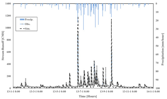 The HEIFLOW model in the Miho catchment was calibrated by the daily GSFLOW modeling research from Joo et al. [17]. The HEIFLOW model was employed to verify the hydrological processes in the Miho catchment with hourly time step in 2013. Figure 2 shows the model evaluation of the Miho catchment by the Nash–Sutcliffe model efficiency coefficient (NSE). The gray line indicates the observed stream runoff at the outlet of the Mho catchment at the Hapgang water level gauging station, and the black dashed line represents the HEIFLOW model simulation. The blue bar graph in Figure 2 indicates the hourly rainfall at the Sejong-si rain gauge station, which is the nearest rain gauge station from the outlet of Miho catchment. The model performance of the Miho catchment indicates appropriate simulation runoff with 0.64 NSE in hourly time step. The stream hydrograph of the HEIFLOW model is generally underestimated in the low flow regime and is overestimated in the peak flow regime.