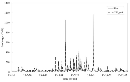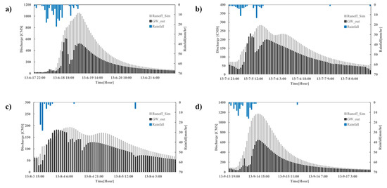 Figure 5 indicates the surface and groundwater interactions during the flood events. This study selects the four flood events in 2013. The details of flood events in this study are described in Table 2. The cumulated rainfall events are shown in Table 2 and the hourly rainfalls are illustrated as the blue bar graphs in Figure 5. Entire flood events in Figure 5a–d show that the groundwater discharges to the stream flow are highly related to the rainfall. In addition, the rising and falling limbs in stream hydrograph are generally affected from the variability of groundwater discharge to the stream. The responses of the GW_out and stream runoff indicate that stream runoff is faster response than the GW_out from the rainfall. The flood events in Figure 5 have the multiple rainfall events except Figure 5c. The GW_out in Figure 5 shows that GW_out patterns affect the peak discharge in the stream. For example, GW_out in Figure 5a,c showa similar patterns, and these two events have the multiple peaks in stream discharge. Both events also show that GW_out is dramatically reduced after the first peak of GW_out. The variabilities of GW_out are causing to mitigate the peak stream discharge and make multiple peaks in the streamflow hydrograph. However, the event 4 in Figure 5d indicates the different fluctuation of GW_out to the event 1 and 2. The fluctuation patterns of GW_out in event 1 and event 4 show that the peak stream discharge of event 4 is approximately 100 m3/s larger than event 1 although the rainfall is smaller than event 1.