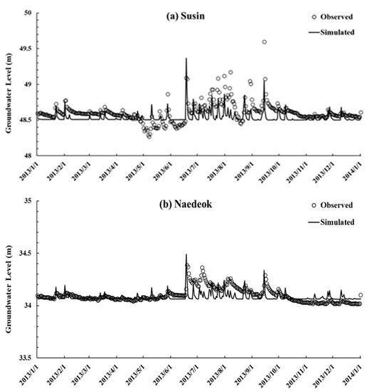 Comparison of the simulated and observed groundwater level at two monitoring wells: (a) Susin and (b) Naedeok.