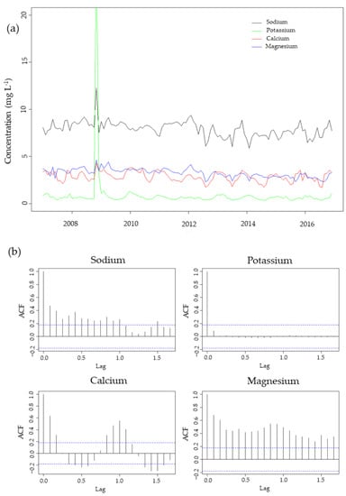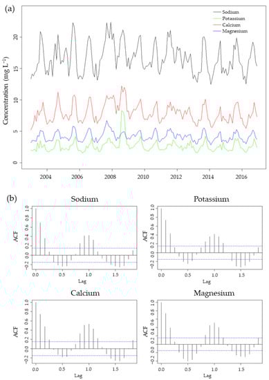 - Sande-Fouz, P.; Mirás-Avalos, J.M.; Vidal-Vázquez, E. Temporal oscillations of calcium, magnesium, potassium, and sodium dissolved contents in an agroforestry catchment from the Atlantic Galicia. Comm. Soil Sci. Plant Anal. 2012, 43, 280–287. [Google Scholar] [CrossRef]