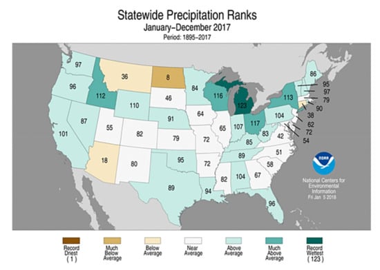The map shows that more than half of the states in the continental US experienced above average precipitation. NOAA ranked the year 2017 the 3rd warmest and the 20th wettest year on record, with precipitation being above average for the five consecutive preceding years.