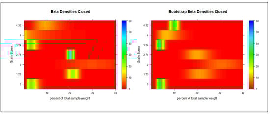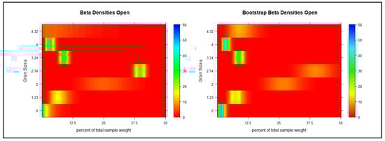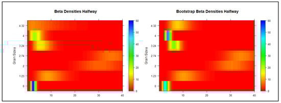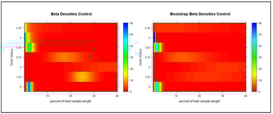 Figure 3 shows the PDF and CDF of the beta distribution for the original samples as well as the bootstrap sample of the control test. Heatmaps for the original samples as well as the bootstrap sample of the control test are depicted in Figure 4. The fraction of the sample weight for small, relatively small, and very large grain sizes is almost zero (Figure 3 and Figure 4). The fraction of the sample weight for the very small and large grain size is up to 60%, while the fraction of the medium size and relatively large grain size is up to 30%. The fraction of the sample weight for the very small grain size is between 5% and 60%, for the medium size is between 10% and 30%, for the large size is between 20% and 60%, and for the relatively large size is between 20% and 30%. As demonstrated in Figure 4, the medium, large, and relatively large sediment sizes made up more of the sample weight. Comparing this to the bootstrapped data, some similarities are observed. However, the densities of the data are less extreme, and the curves of the mid-range sediment sizes (medium, large, and relatively large) and the very small sediment size have stretched over a broader range. For example, the medium grain size was originally peaked somewhat steeply at around 25% of the total sample weight, while the tails of the curve asymptote to 0 at around 10–30%. However, comparing the same grain size of the bootstrapped data, the density peaks at around 15% of the total sample weight, while the tails span from 0% to around 35%. The PDFs for the same control test show that the very small or very large grain size will make up less of the sample, while the coarser size is more likely to make up a larger fraction of the sample. Similar results are interpreted from the bootstrap PDF. However, just as the bootstrap CDFs were stretched over the x-axis, the bootstrap PDFs are demonstrating a similar stretch over the x-axis. This shift means that of the bootstrapped data, the grain sizes are more likely to make up a larger range of the total sample. For example, the distribution of the original sample shows that the relatively large grain size has less than 10% probability of making up 20% of the total sample weight, while the bootstrap distribution data suggest a 30% chance of the relatively large grain size making up the same fraction of the sample (20% of the total sample weight).