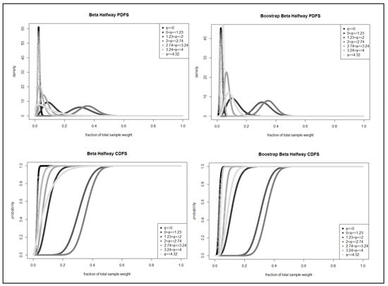 Halfway design setting—beta distributions of original samples along with bootstrap distributions.