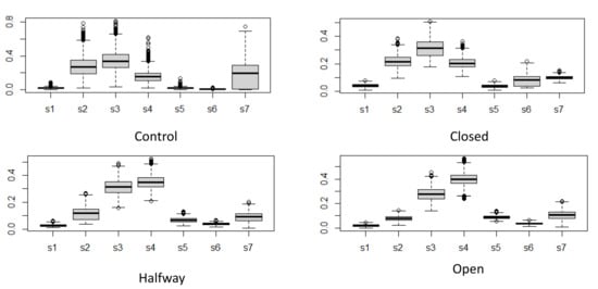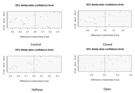 We also visualized the weight distribution for different grain sizes using the boxplot. Results are depicted in Figure 11. By visual inspection, we can notice the difference in the mean weight for different grain sizes in all settings, including control, closed, halfway, and open. To investigate the statistical significance of mean weight differences for the different grain sizes, we used Tukey’s ‘Honest Significant Difference’ method. In this way, a set of confidence intervals were constructed for the differences between the means of different grain sizes with the specified family-wise probability of coverage where the intervals are based on the studentized range statistic. As we can observe in Figure 12, no confidence interval contains zero, rejecting the null hypothesis that any given pair of grain sizes have the same mean weight. Lower bound, upper bound, and p-value for all confidence intervals for the different settings are reported in four tables in the Supplementary Materials. Careful interpretation of the heatmaps and Tukey’s confidence intervals suggests significant differences in the weight proportion of each grain size. We must point out that while heat maps visualize the weight percentage of each grain size, Tukey’s confidence intervals demonstrate the difference in the mean weight percentages of the different grain sizes.