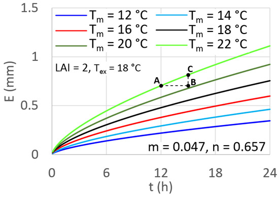 By using Equations (18) and (20), an example of ΔE calculation (Equation (19)), which is useful for the applications that will be shown, is performed here. Let assume m = 0.047, n = 0.657, Tex = 22 °C (Figure 6), and an evaporation loss ΔE for a mean temperature of Tm = 22 °C needs to be determined. The interception capacity S equals 1.5 mm, and the interception volume stored in the canopy ICS when the evaporation process takes place equals 0.8 mm, thus the difference S − ICS = 0.7 mm mimics the amount water loss due to a virtual evaporation till E0 (Figure 6). The corresponding initial condition t0, calculated by Equation (20) provides 12 h. The pair (t0, E0) is illustrated in Figure 6 (point A).