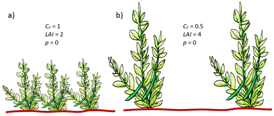 The fraction of ground covered by the canopy [40] plays a fundamental role in estimating interception losses, as well as the proportion of rain that falls through the canopy without striking any surface. In the following, in order to analyze the water mass balance, CF denotes the fraction of ground covered by the canopy and p is the free throughfall coefficient [19,20]. Assuming p = 0, meaning that the canopy fully covers the ground at the plant scale, Figure 7 shows two very different conditions in terms of LAI and CF, which could provide similar evaporation losses, since high CF (Figure 7a) could be counterbalanced by low LAI (Figure 7b), and vice versa.