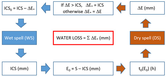 For a simple sequence of three WSs and DSs, interception loss during WS, and evaporation loss, ΔE, during DS, with E0 = S − ICS as initial condition. For the third DS, the condition described by Equation (21) occurs (ΔE > ICS) and = ICS.
