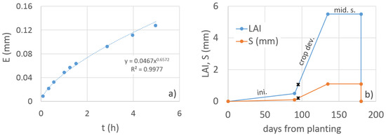 According to Brisson et al. [45], the interception capacity was assumed S = 0.2 LAI. Thus, with increasing LAI during crop growth and decreasing LAI during senescence, S will increase and decrease, respectively. More recently, this relationship between S and LAI was also considered by Kozak et al. [46]. Figure 10b also graphs the S variation during the days from planting. The interception capacity in the day of sampling (cross symbol), i.e., after 95 days from the day of planting, was equal to 0.202, not too far from that experimentally measured (0.156).